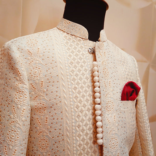 Golden and Maroon Sequence Embroidered Open Prince Coat with Loops Kurta Trouser 2005