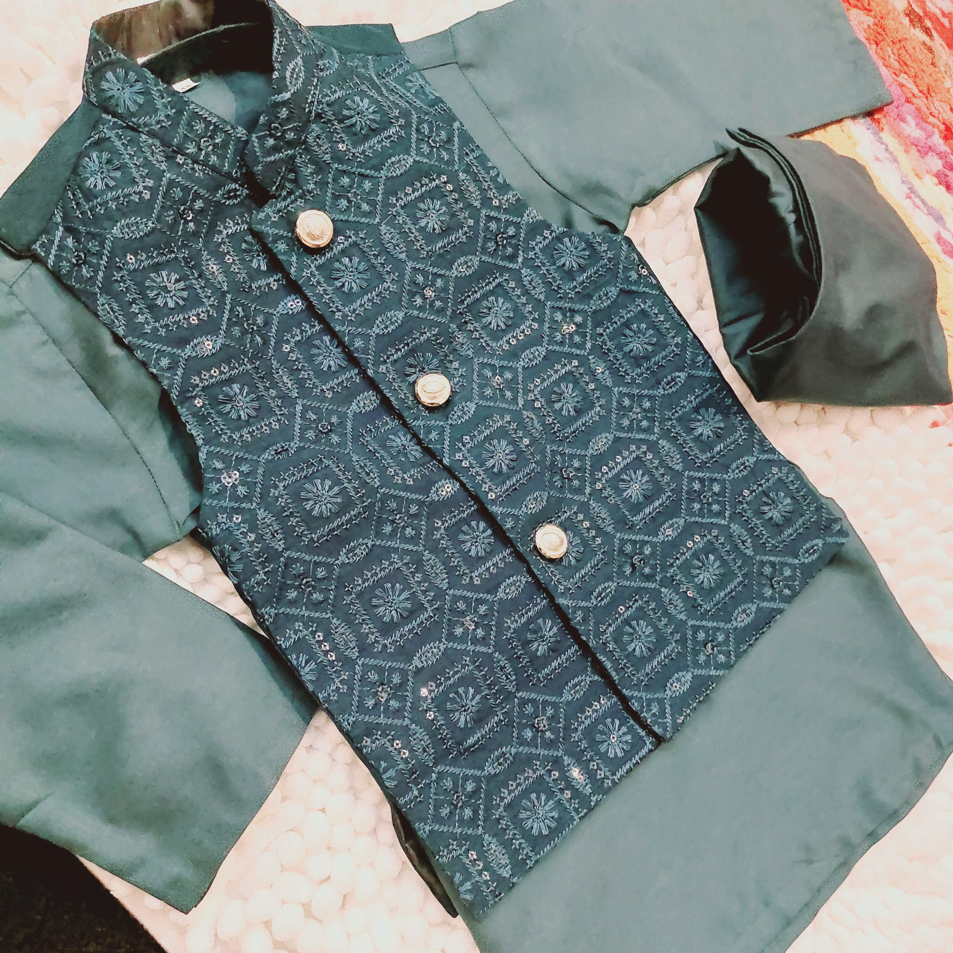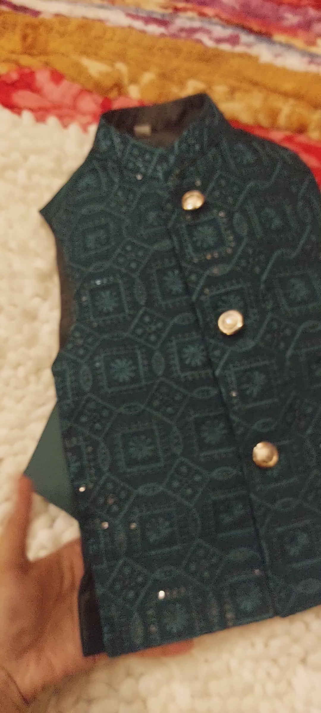 This waistcoat features a beautiful green mysore fabric with intricate sequence detailing. Designed for a comfortable fit, it pairs perfectly with our kurta trousers for a stylish and traditional look. Elevate your child's wardrobe with this elegant piece.