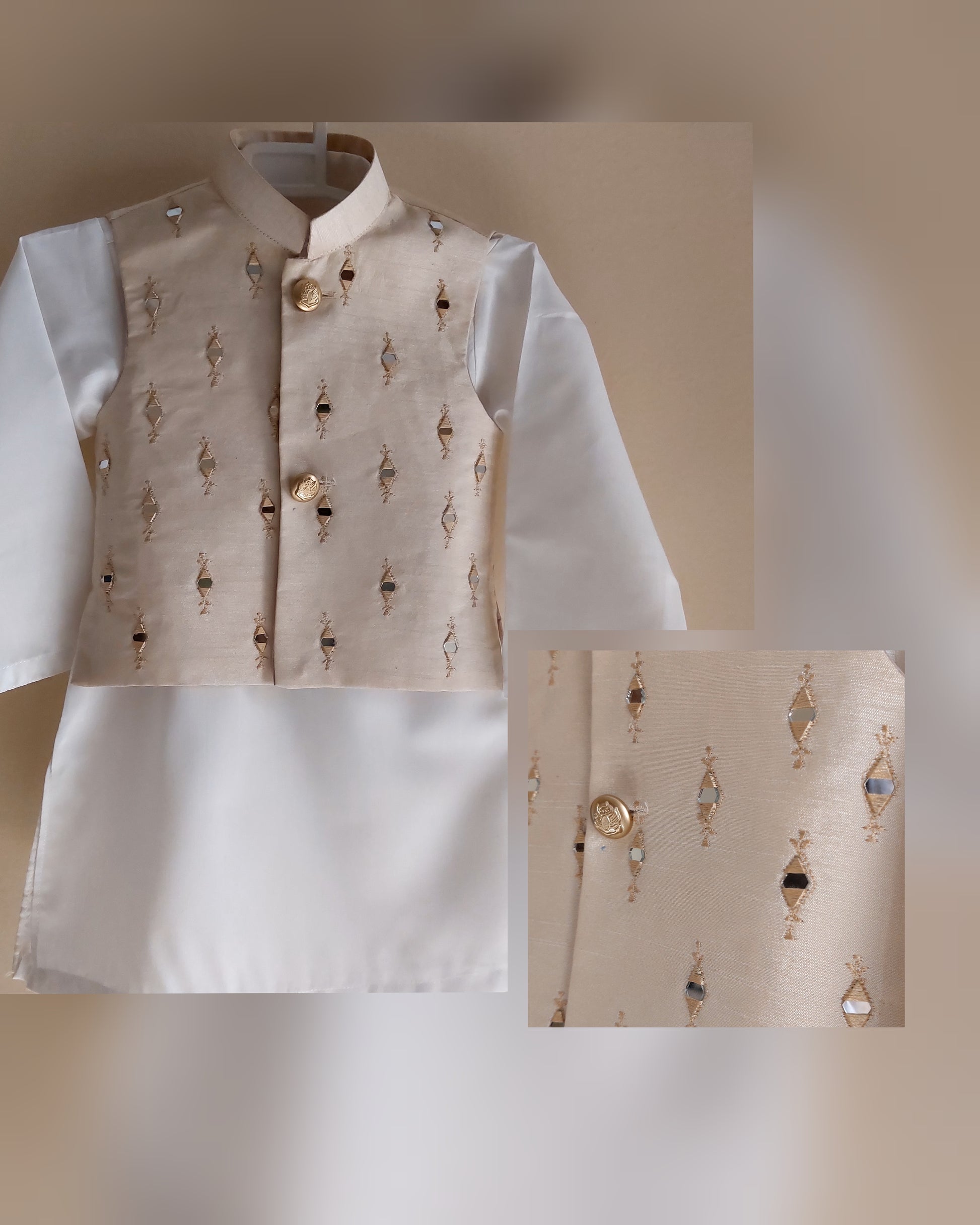 This is a waistcoat made of Maysuri fabric with mirror work embroidery.