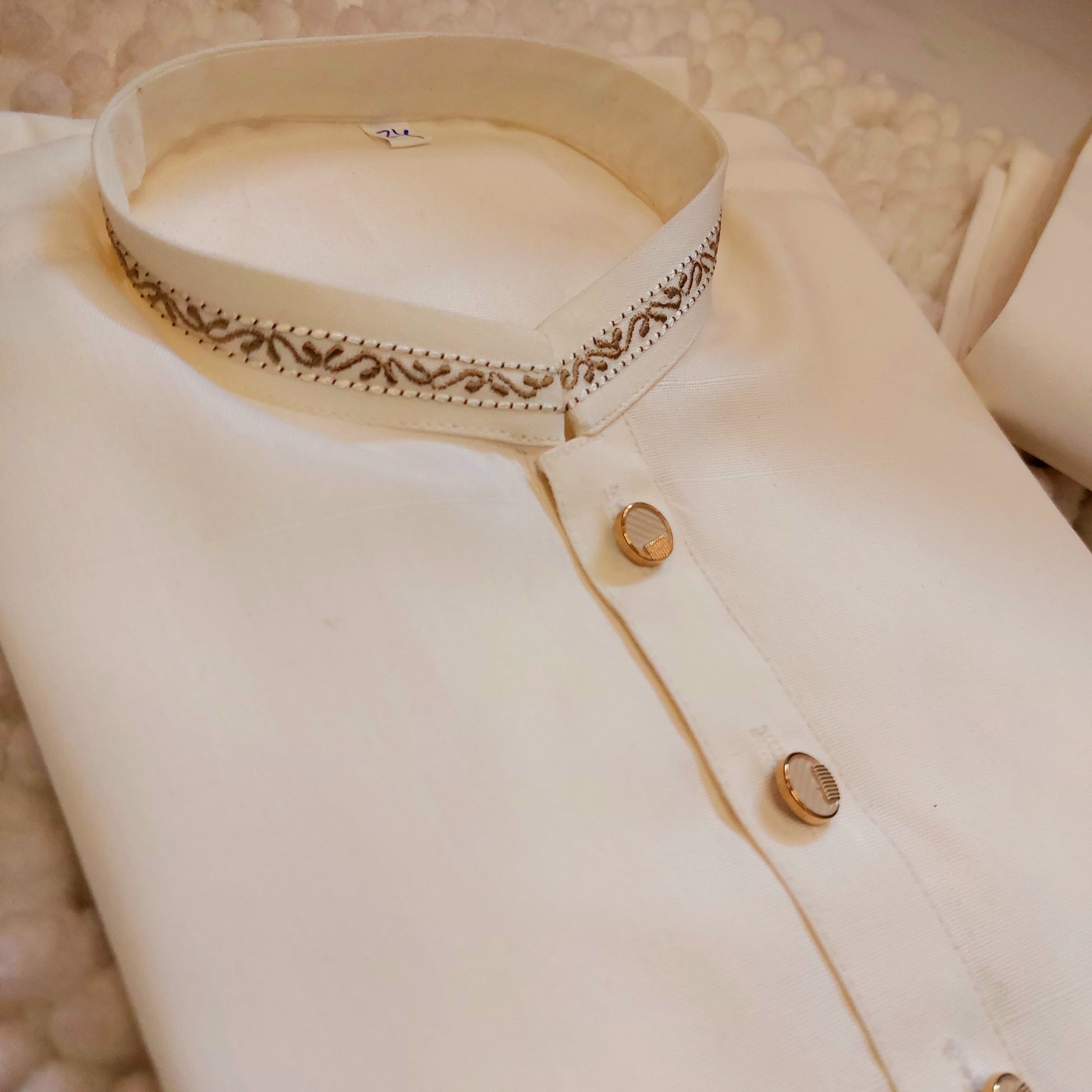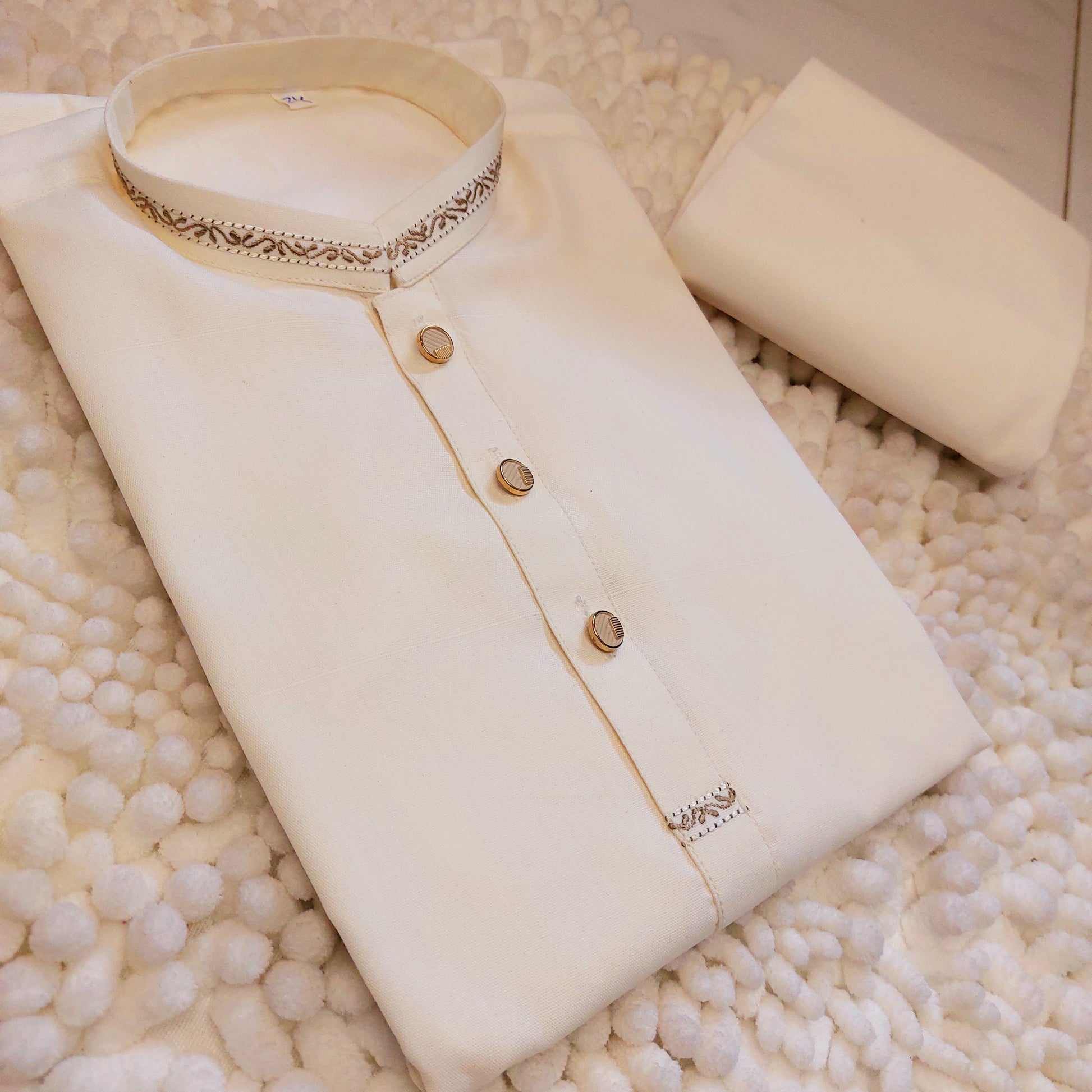 This Kurta and Trousers are made of high-quality cotton and feature an intricate embroidery design. Elevate your wardrobe with this elegant and versatile piece.