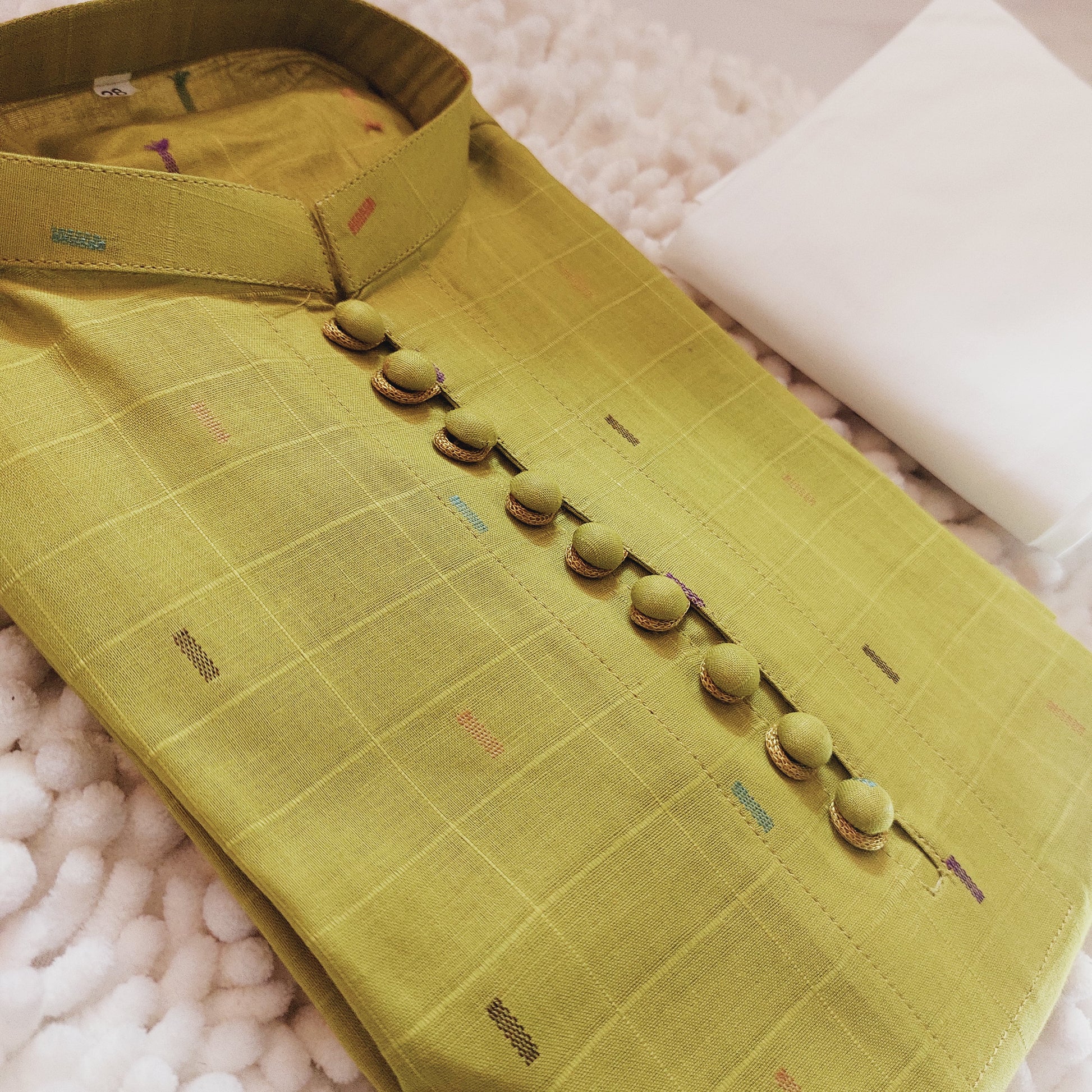 This garment is crafted from premium cotton fabric and features stylish loops and buttons. It also includes convenient side pockets for added functionality.