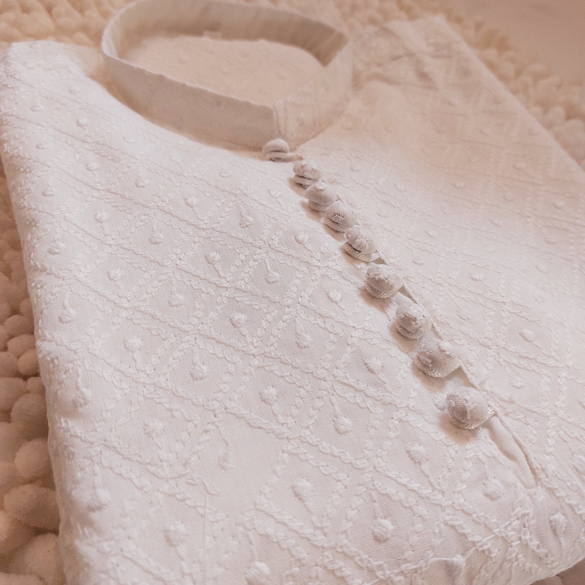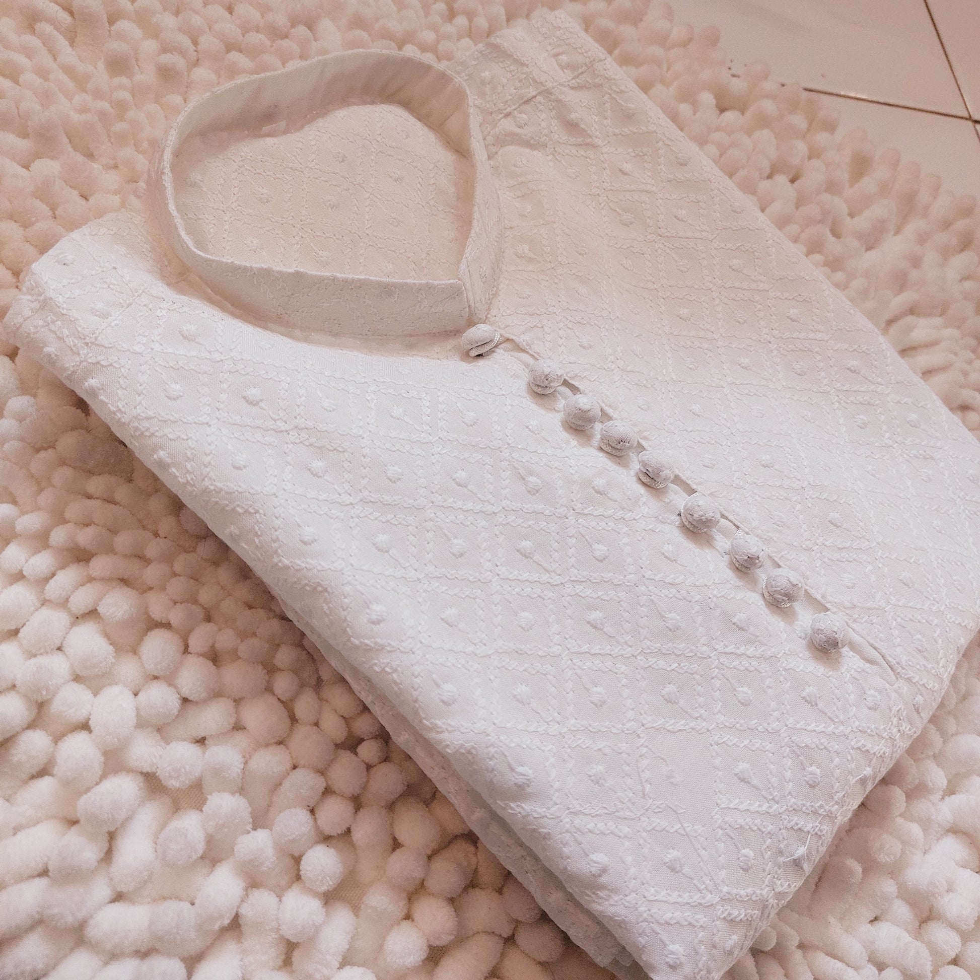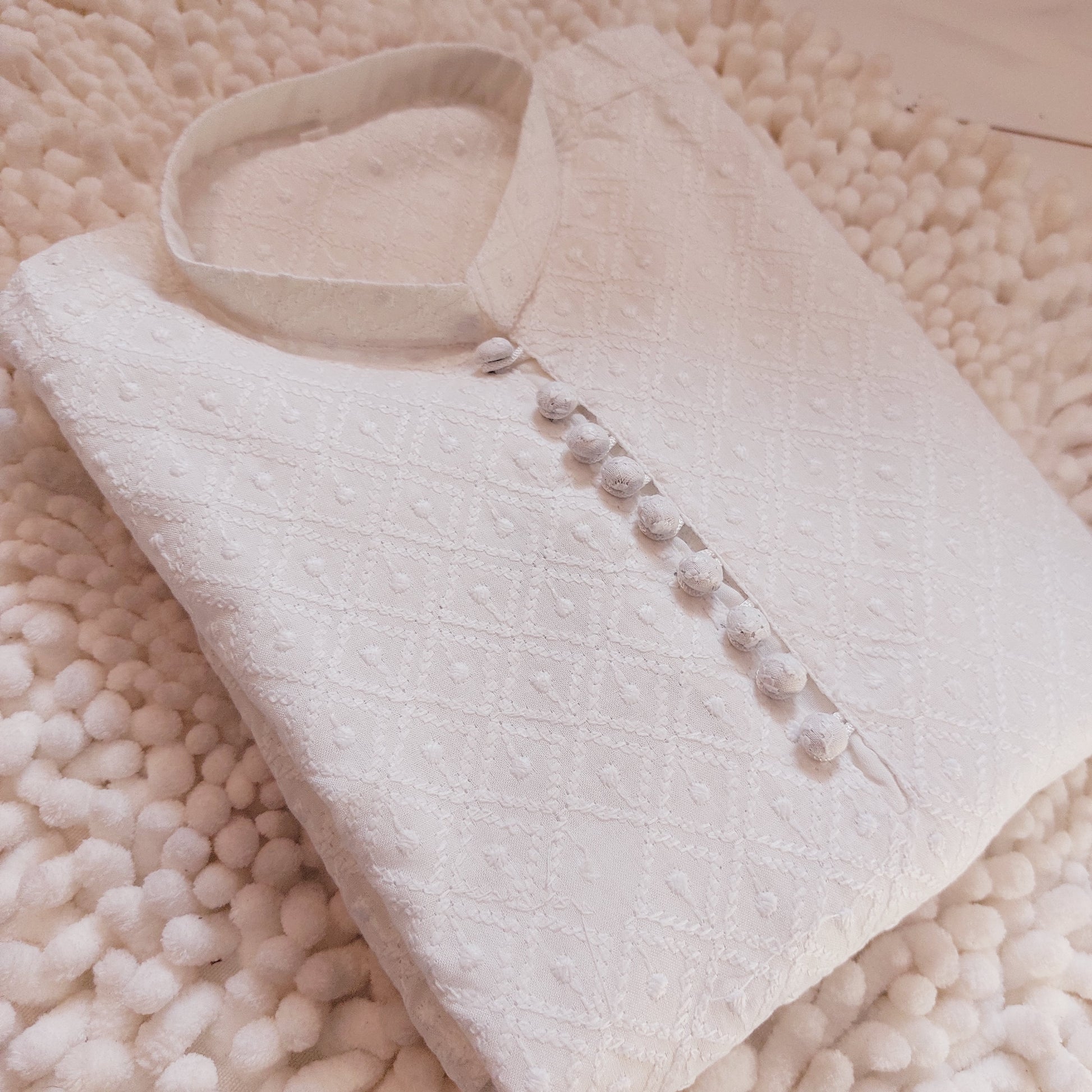 The White Chicken Kari Kurta is designed for comfort and style. Made with high-quality chicken fabric, this kurta offers a soft and breathable wear. Its lightweight and airy design makes it perfect for any occasion, providing both functionality and fashion. Upgrade your wardrobe with this versatile and unique kurta.
